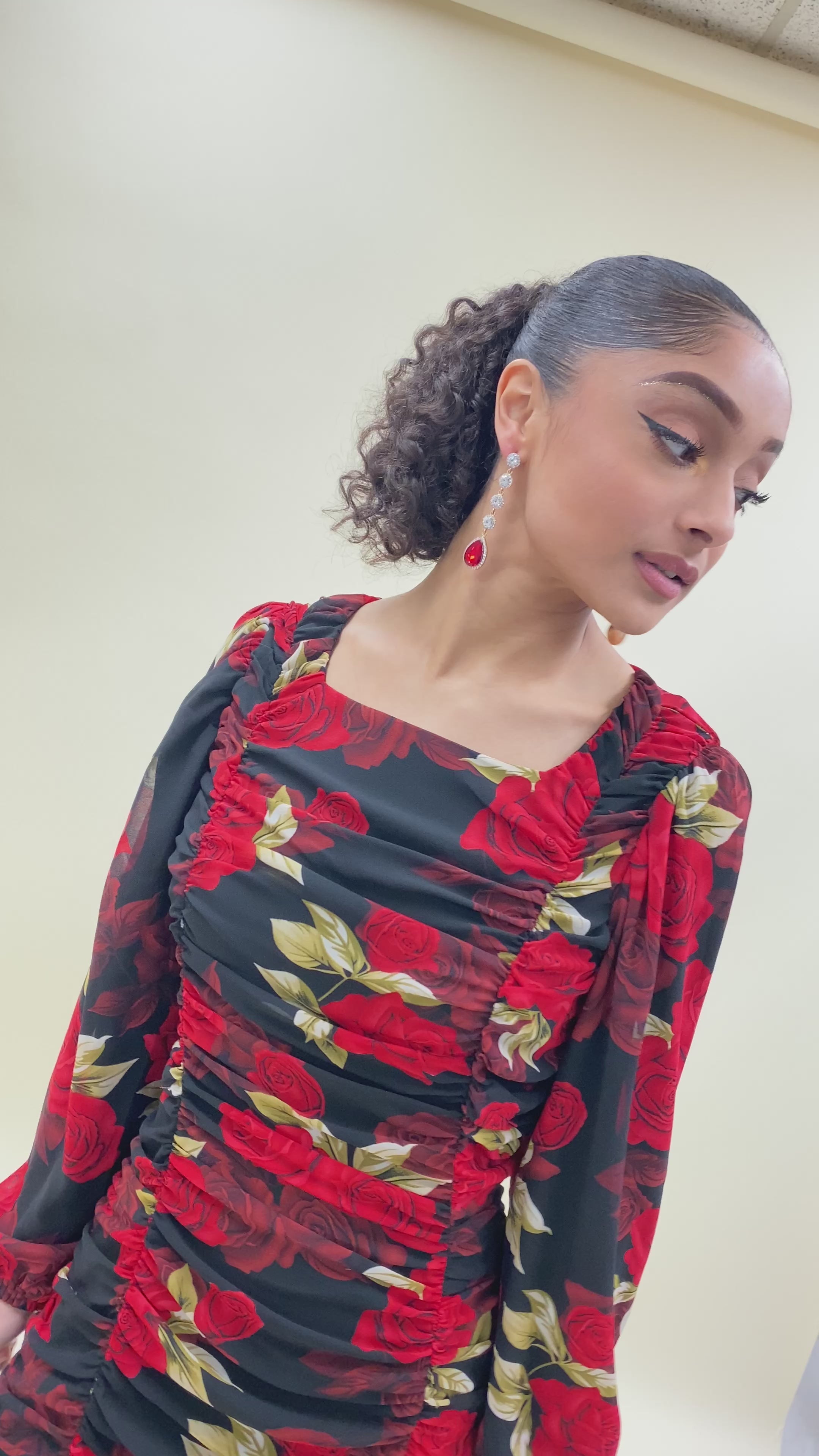 Featuring a high quality roses floral print Chiffon material with exaggerated sleeves and a ruched design.